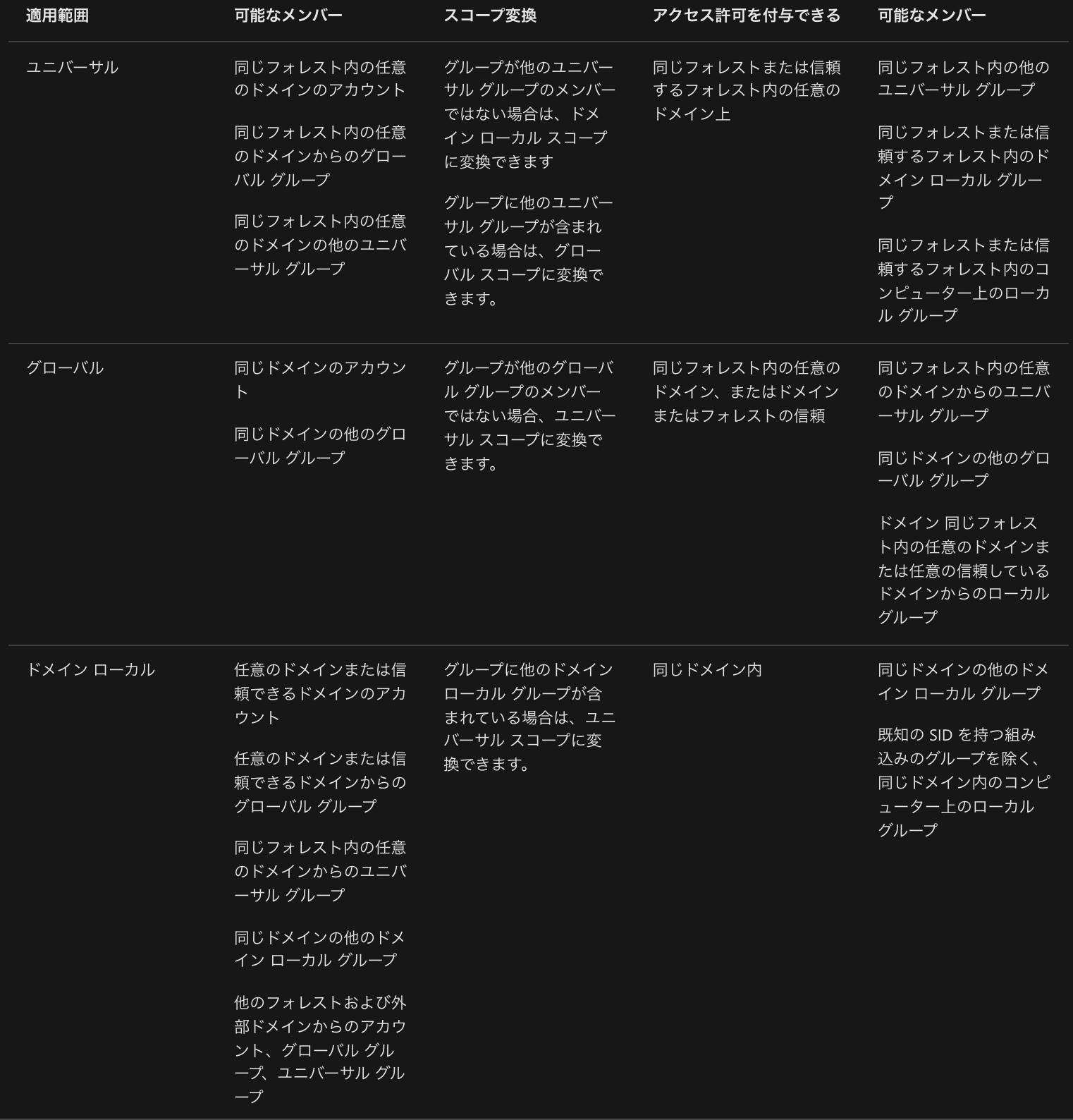 まずセキュリティグループにはスコープというものがあり、これによってどの範囲のリソースの権限をつけるか、どんなユーザを所属させられるか管理することができます。別の言い方をするとスコープによっては権限がつけられなかったりユーザやグループを所属させることができないのでこの辺りの制限を把握しておくことは重要です。