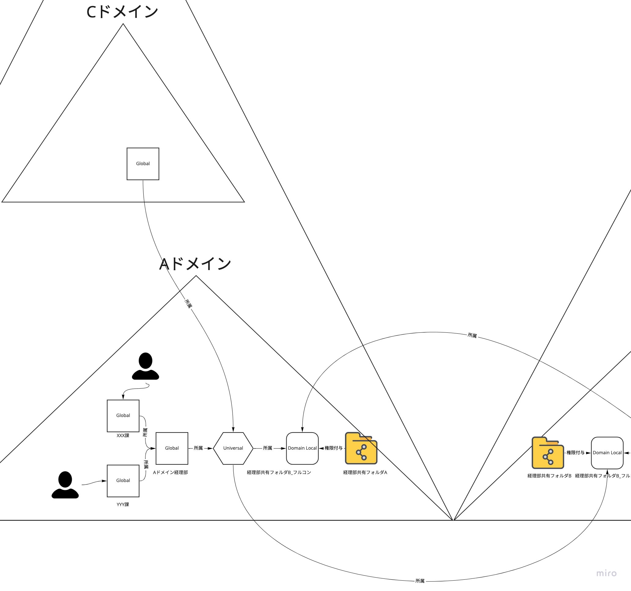 ①と考え方は同じですが、他ドメインもメンバーに持たせるためにユニバーサルグループを追加しています。